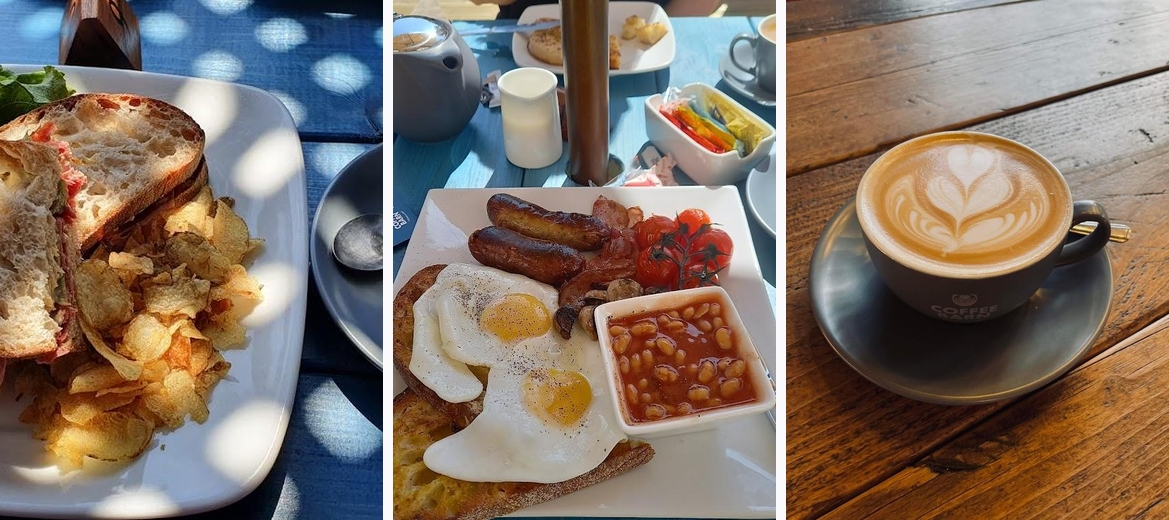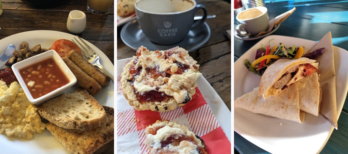Coffee Barn offers a variety of foods, including breakfast classics like the Full English, vegan options, and a selection of delicious cakes and pastries. There's something for everyone.
